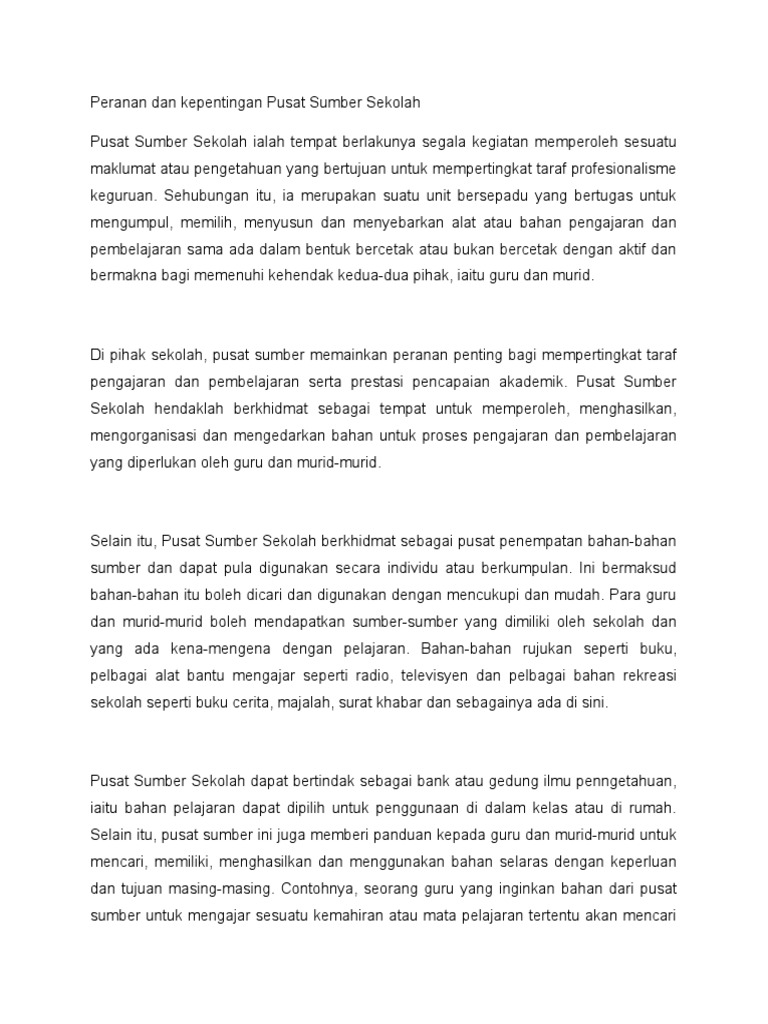 Anda sebagai pengawas pusat sumber sekolah jelaskan. Pihak sekolah hendaklah memastikan pusat sumber menjadi kekal relevan. Contoh karangan usaha usaha menggalakkan murid berkunjung ke pusat sumber sekolah.